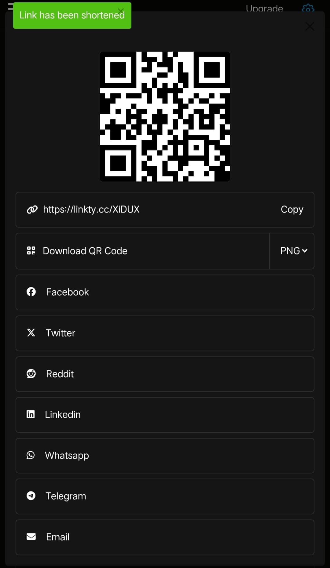 Note: You can customize the link shortener, copy to the clipboard, view statistics, or share your short link to Facebook, Twitter, WhatsApp, or a QR code. See also Link Features.